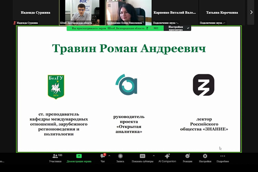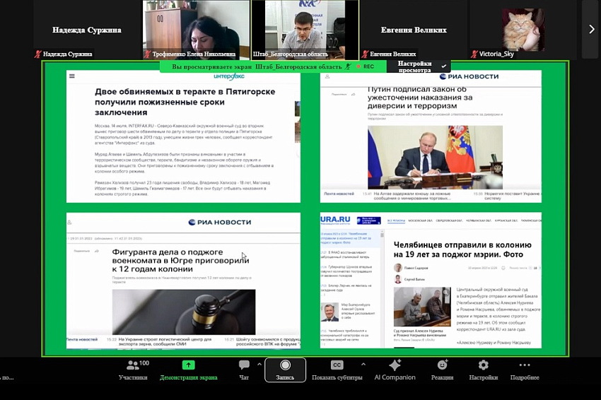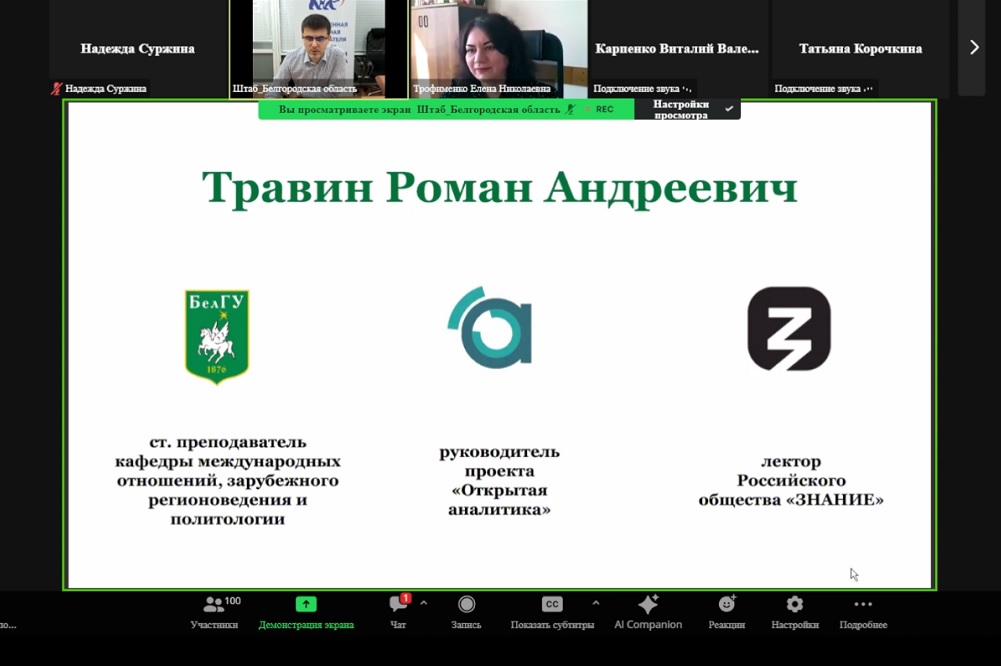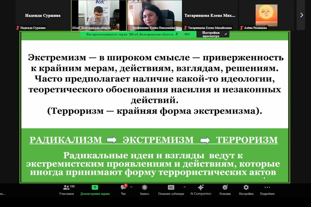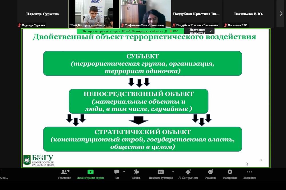 Лекция по профилактике экстремизма и терроризма в студенческой среде на тему «Терроризм: сущность явления и его опасность для общества» прошла в дистанционном формате. Модератор встречи начальник отдела по организации воспитательной деятельности Белгородского госуниверситета Елена Трофименко отметила, что тема на сегодняшний день крайне актуальна, поскольку многие студенты стакиваются с попытками вовлечения в противозаконную деятельность.