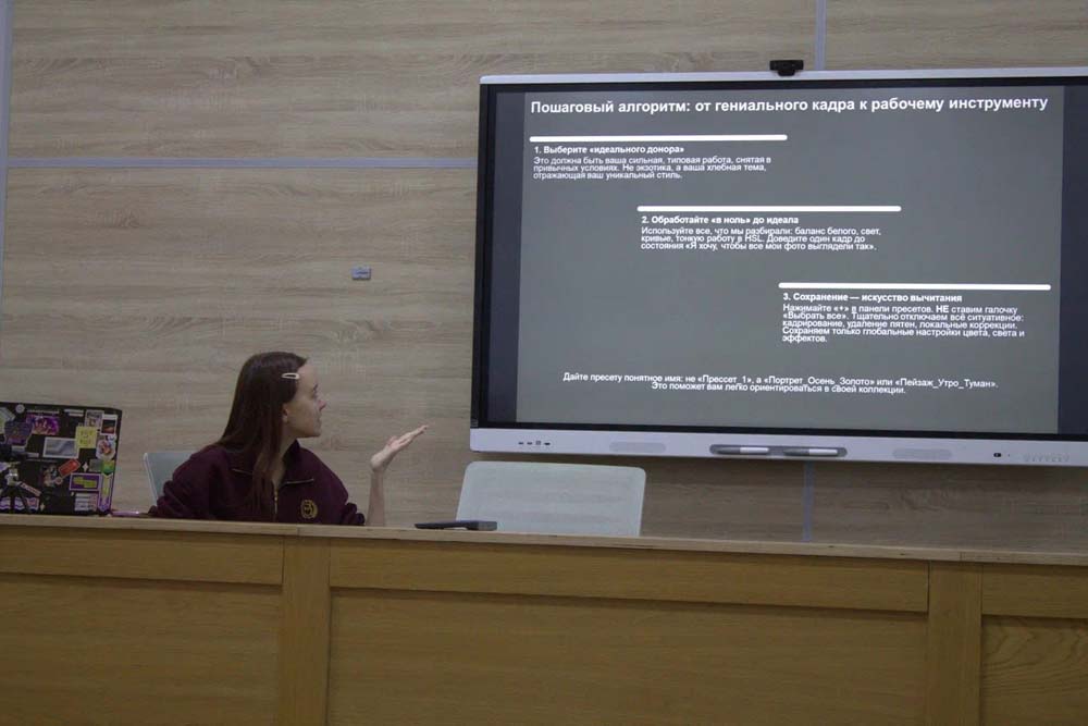 Участники освоили профессиональные техники работы в Adobe Lightroom, научившись создавать собственные пресеты. Эти инструменты позволяют формировать целостный визуальный стиль, который усиливает научное повествование – передаёт точность события, динамику и достоверность кадра.