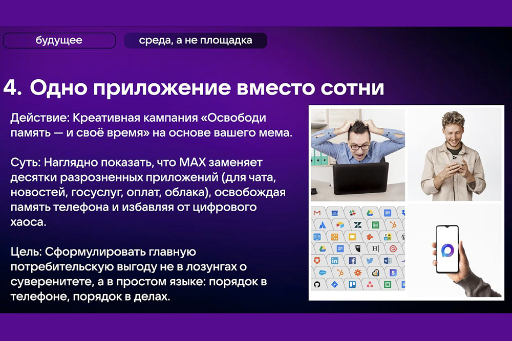 Вторая проектная группа работала в парадигме позиционирования и репозиционирования бренда, а также продуктового пиара. Их стратегия была нацелена на формирование новой айдентики сервиса, акцентирующей уникальные технологические и интеграционные преимущества. Команда предложила пересмотреть нарратив, заявив: «MAX – не «проект-вышибала». Это проект создания суверенного коммуникационного протокола для критически важных сфер». Ключевой идеей стало утверждение: «Настоящая сила и «безопасность» цифрового суверенитета – не в том, чтобы запереть пользователей в единственном сервисе, а в том, чтобы создать сервис, в который они захотят прийти сами». В качестве креативной тактики ребята представили кампанию «Освободи память – и своё время», наглядно демонстрирующую, как MAX может заменить десятки разрозненных приложений, призвав: «Признайте проблему» текущего восприятия и дайте пользователю «реальный, информационный выбор».