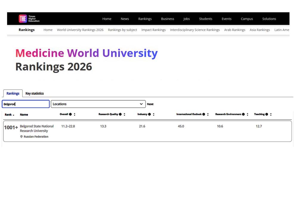 По Медицинским наукам (Medical and Health) количество участников продолжает расти – в новом выпуске их количество достигло 1230, но НИУ «БелГУ» по-прежнему входит в группу 1001+ в мире (в 2025 г. было 1150 вузов); среди 20 российских вузов университет входит в группу 9-20 (в 2025 г. – в группу 11-20 из 20 вузов).