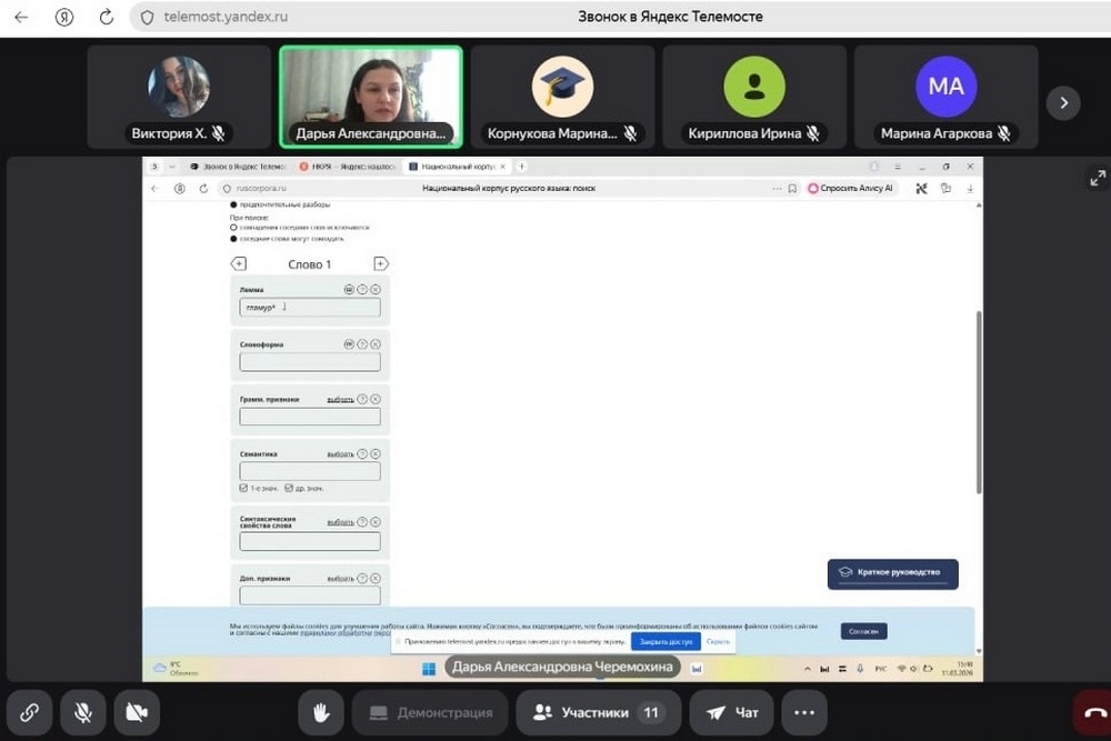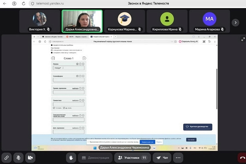 Участники образовательного события обсудили особенности корпусного подхода в изучении языка, рассмотрели работу в обучающем корпусе и корпусе «от 2 до 15». Доцент Дарья Черемохина продемонстрировала основные возможности поиска и новые функции, которые появились в корпусе: генерация упражнений, сравнение портретов слов, анализ коллокаций. Особое внимание было обращено на исследовательский потенциал корпуса, который можно использовать при подготовке проектов и научных статей по лингвистике.